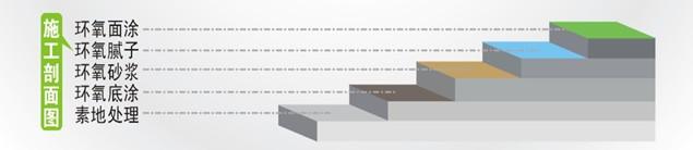 5、環(huán)氧樹脂中涂膩子層:進一步修補,找平地面,為面漆施工做準備。將色漆與固化劑按5:1比例混合,充分攪拌均勻后。加適量石英粉攪拌。用批刀全面批刮,待其干透后,進行打磨清潔處理。