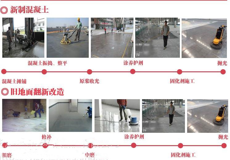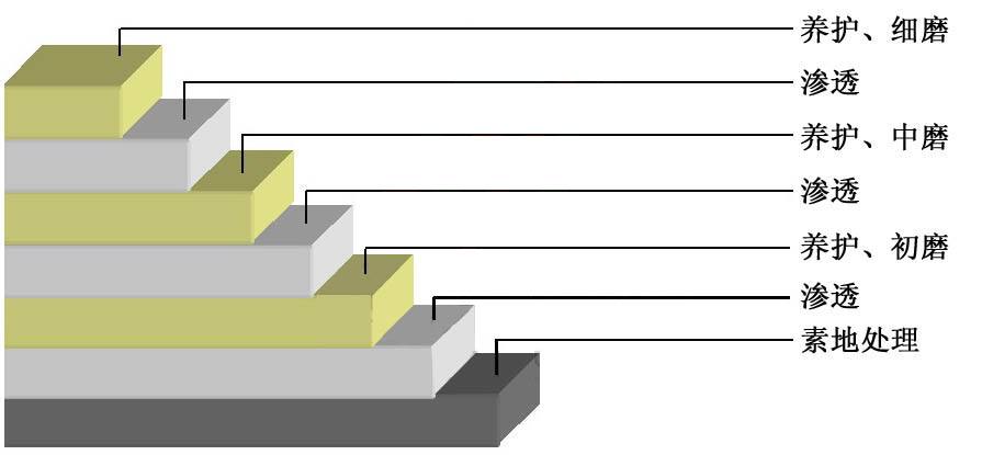施工工藝:(清理基面→打磨、清潔→施工高滲透密封固化劑(特殊基面可進(jìn)行三次滲透或多次)→清洗基面→初步拋光→全面拋光)